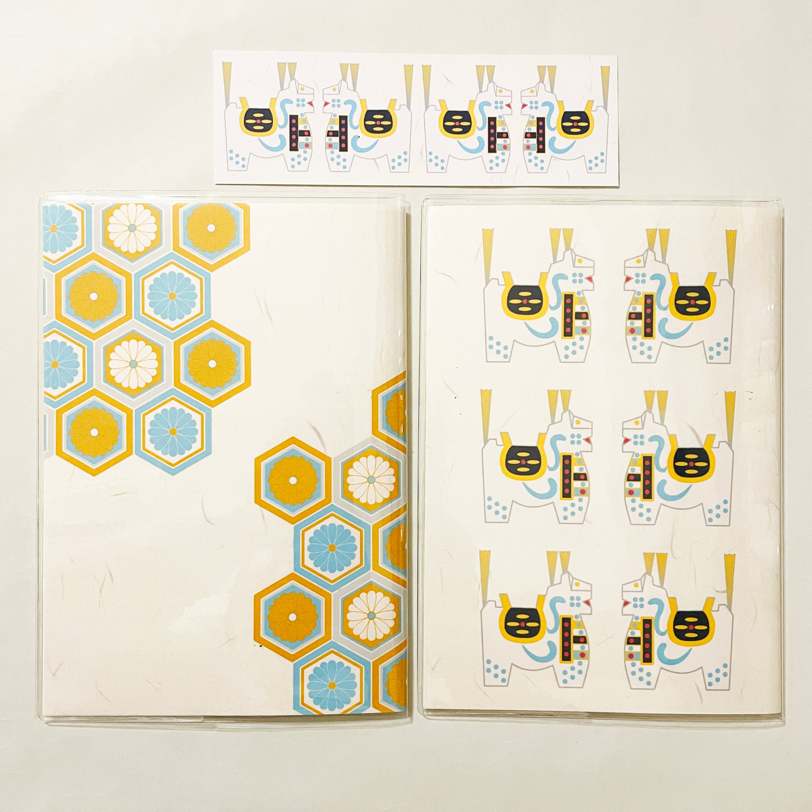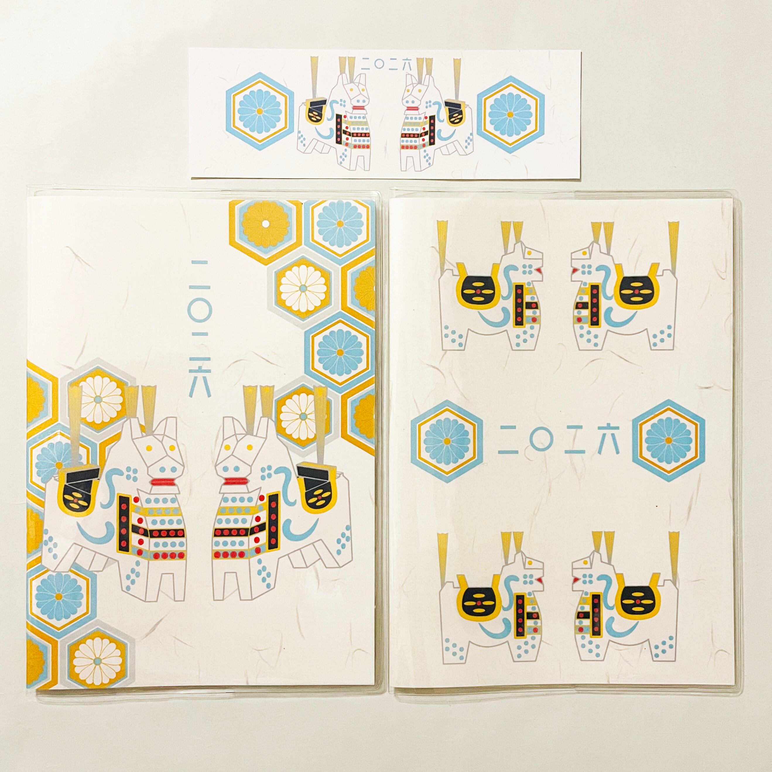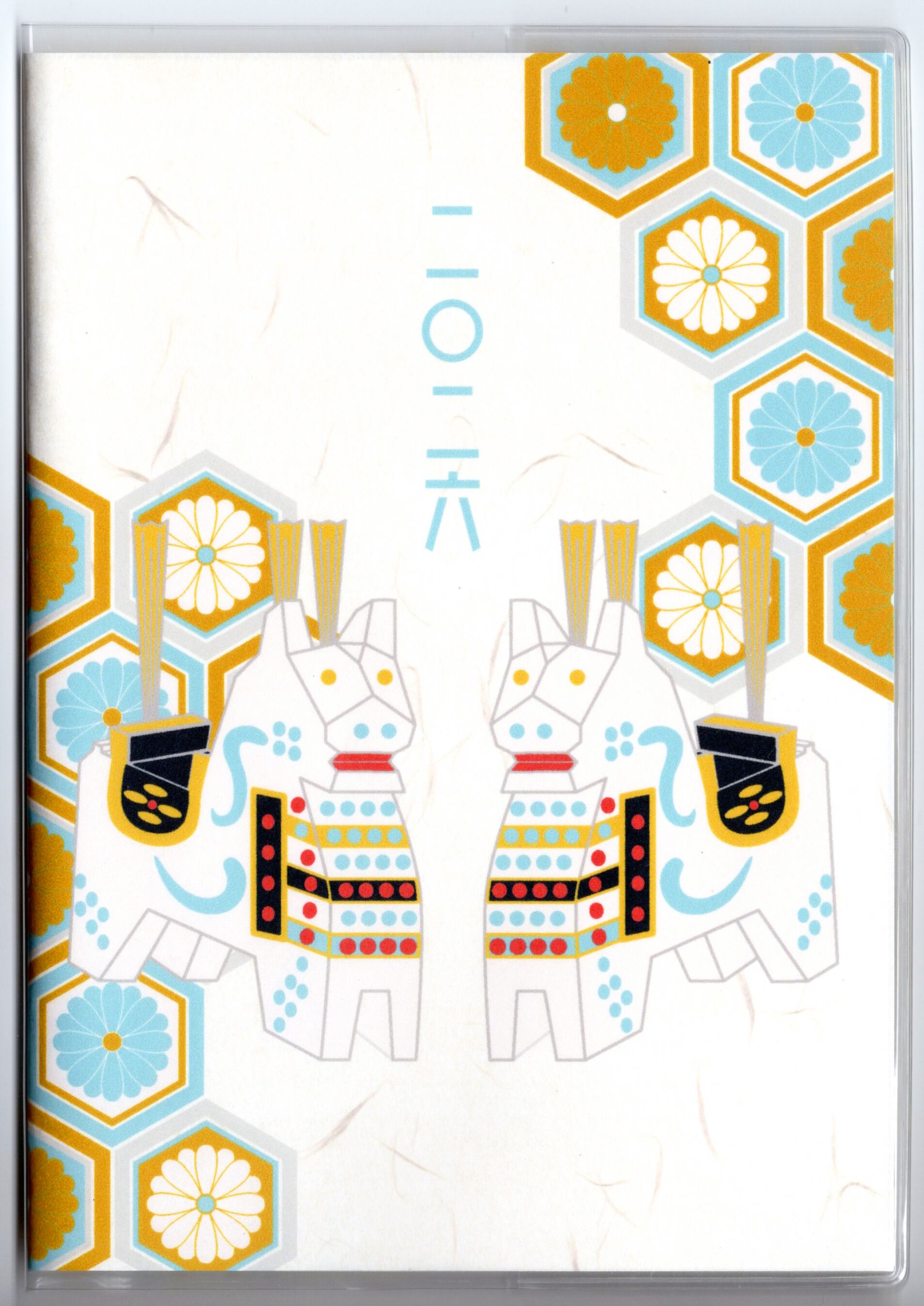『白八幡馬亀甲菊文』と『白八幡馬紋様』のイラストカバー2枚、ビニールカバー1枚、栞1枚、手帳1冊セット。