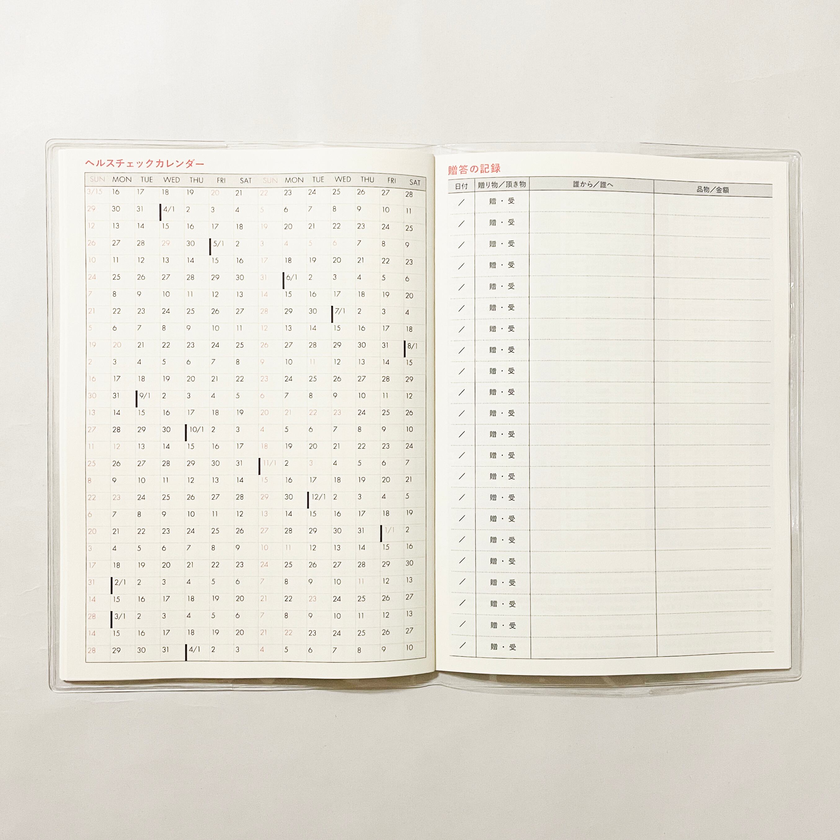 ・ヘルスチェックカレンダー、贈答の記録、年齢早見表、電話番号一覧、パスワードリストなど
