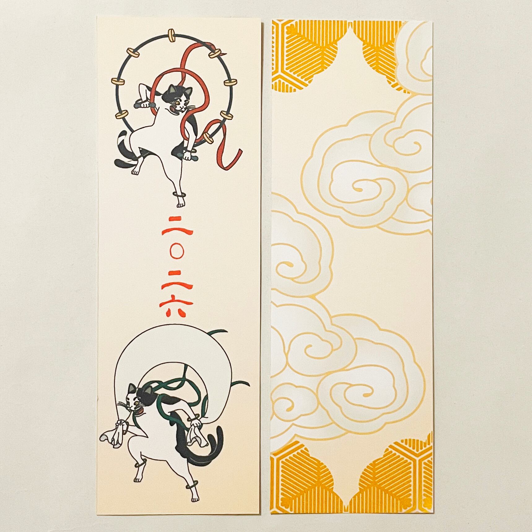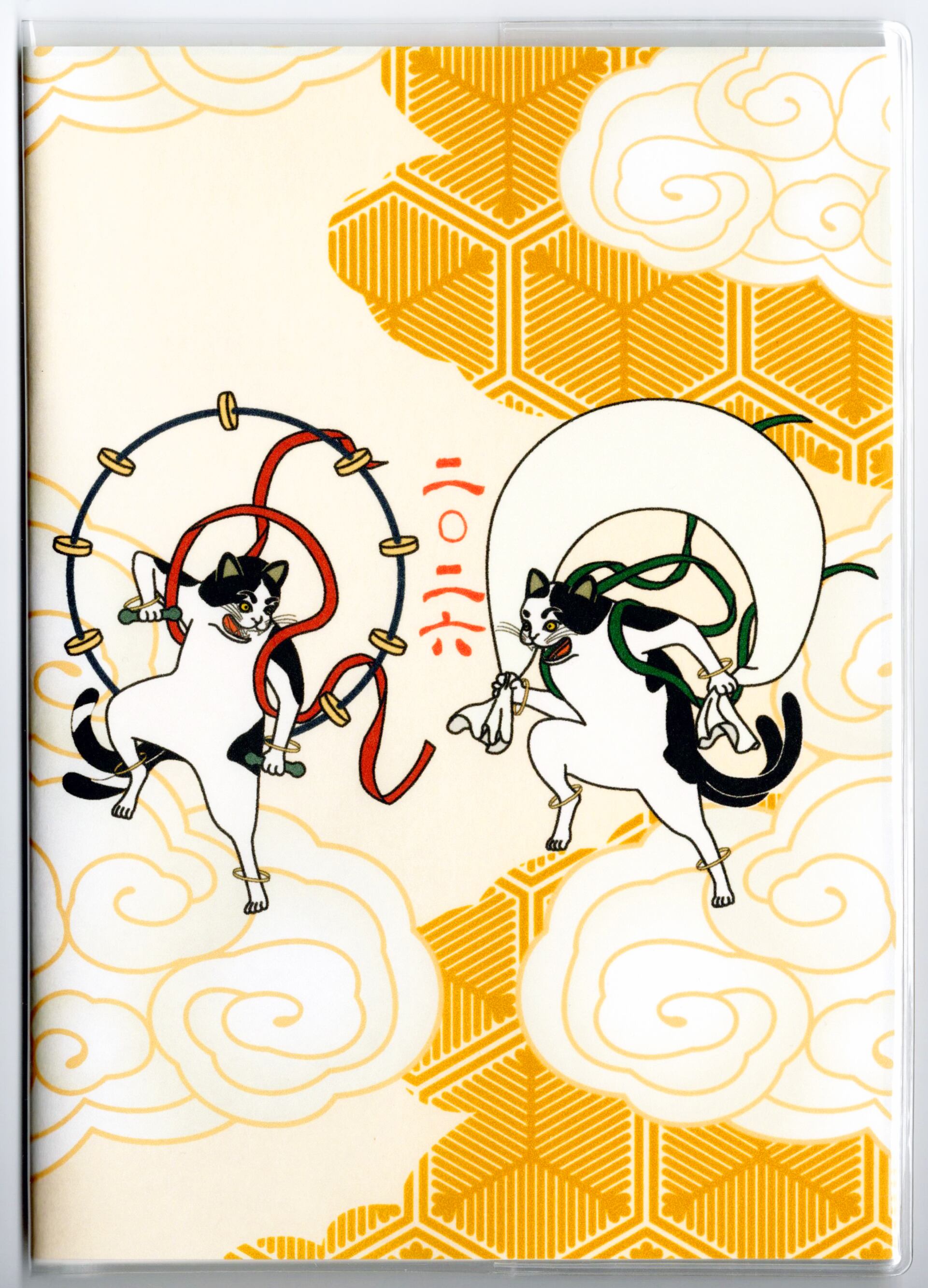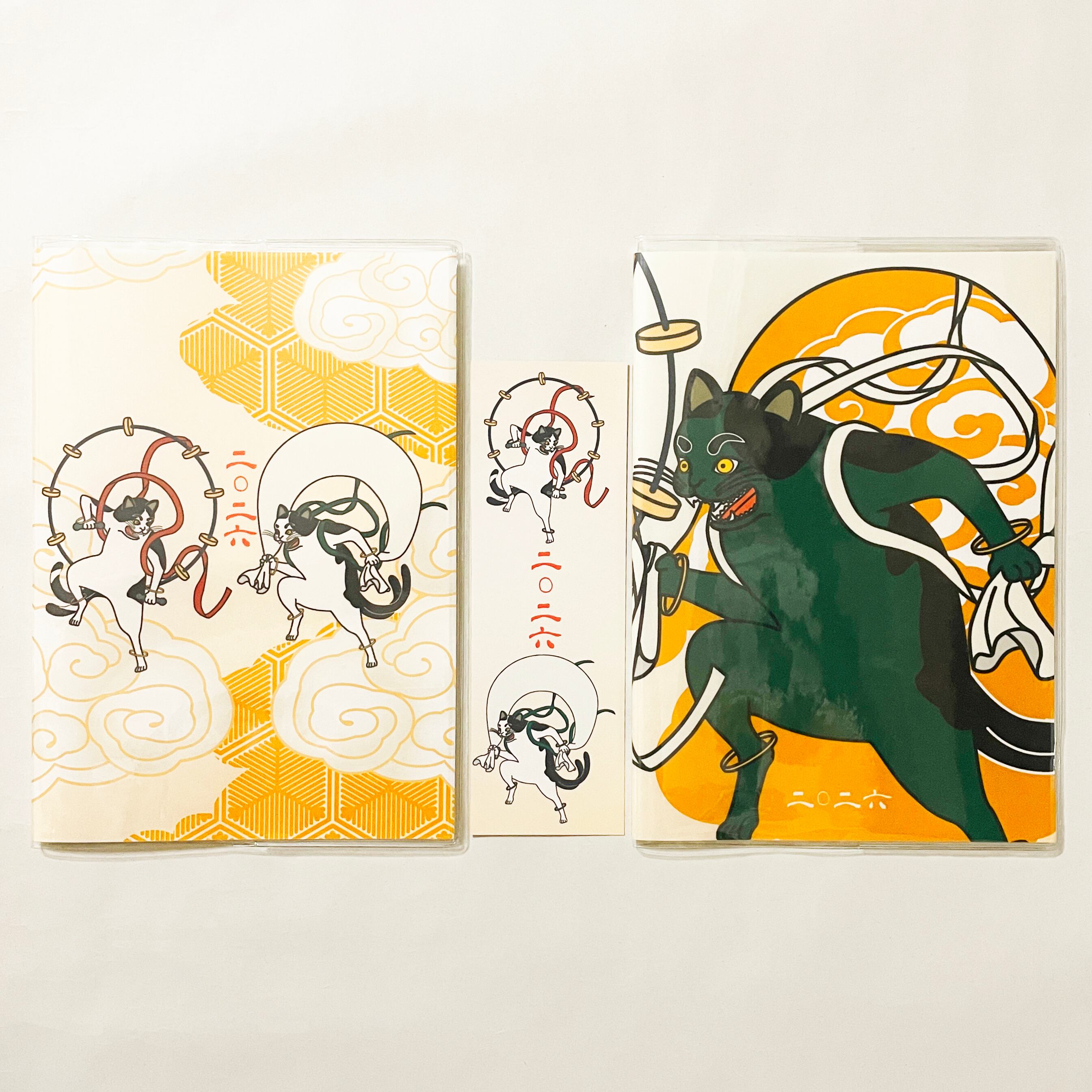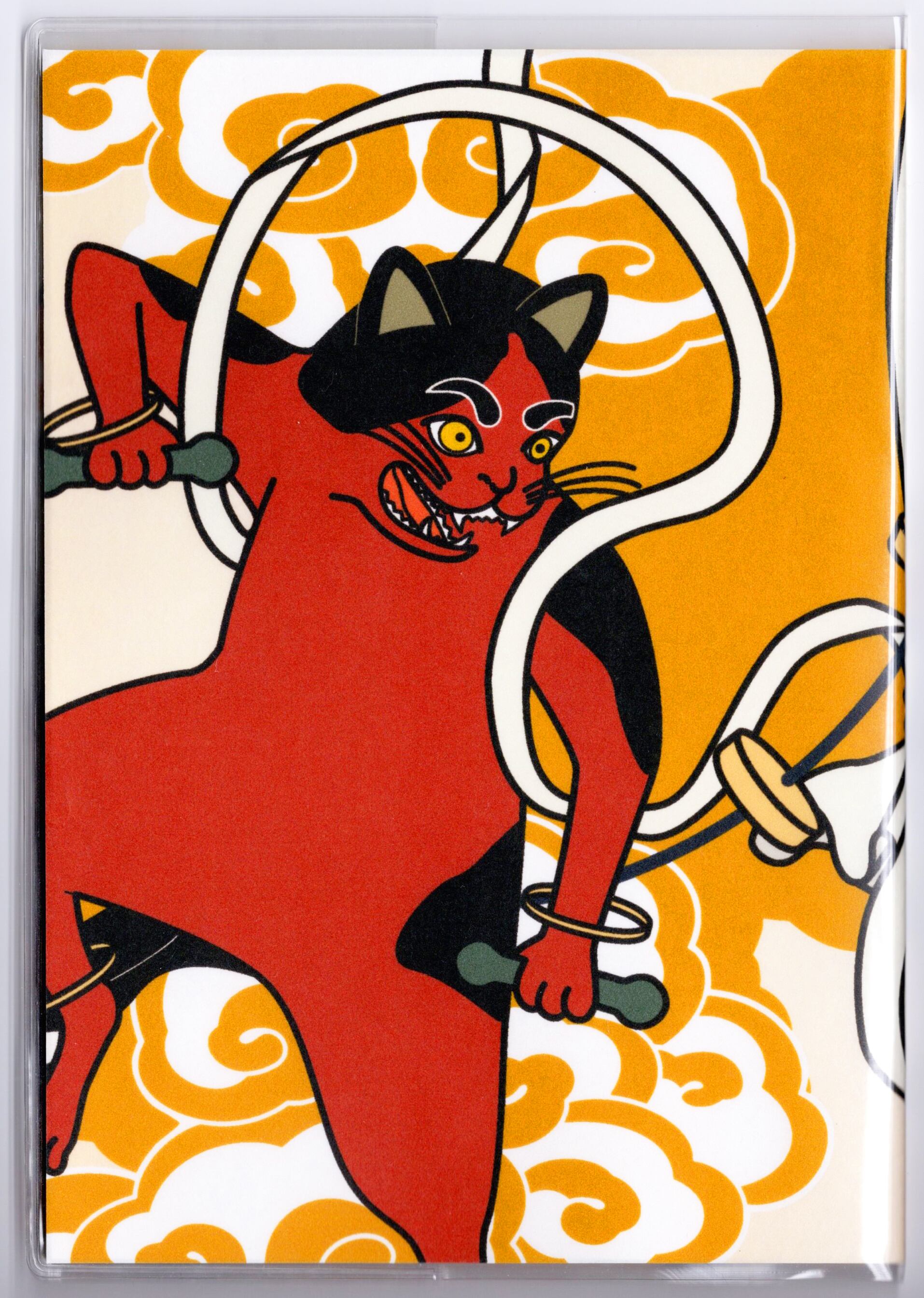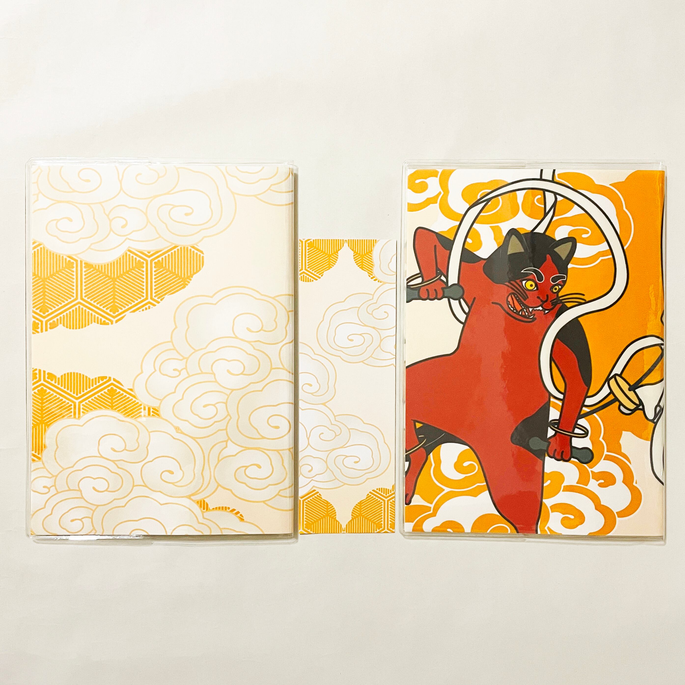 『風神雷神猫又』と『風神雷神猫又-青赤-』のイラストカバー2枚、ビニールカバー1枚、栞1枚、手帳1冊セット。