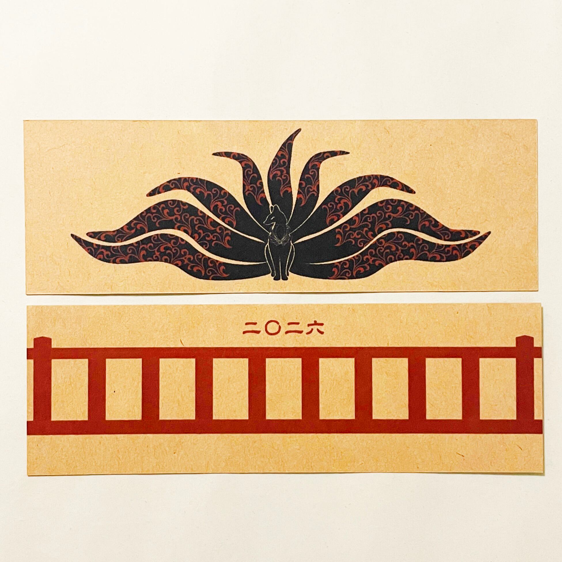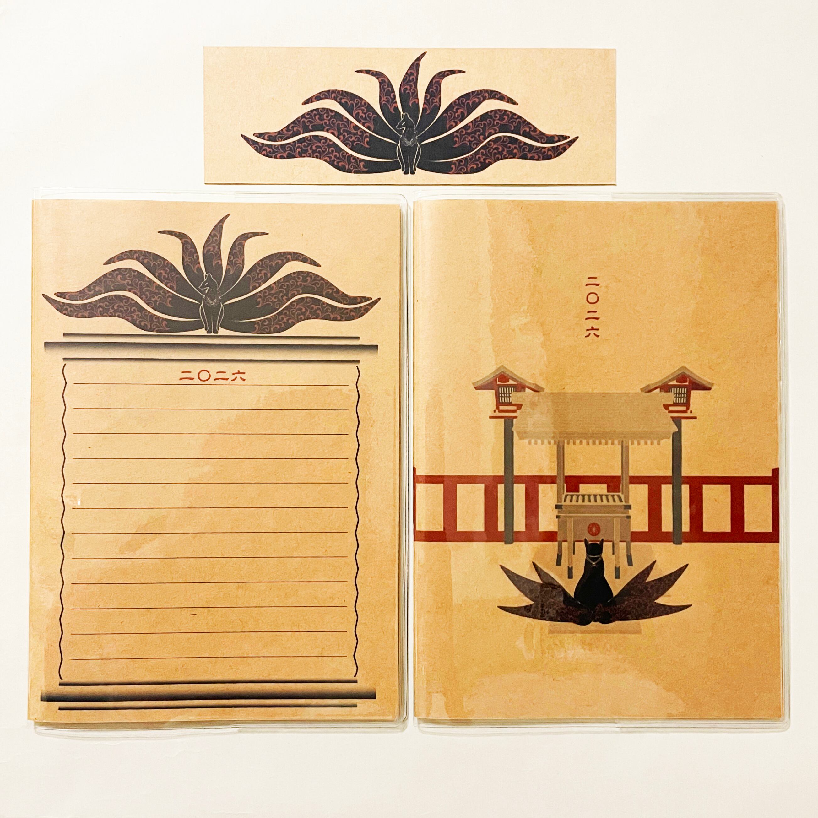 『黒九尾の狐火』と『黒九尾の狐火-御賽銭箱-』のイラストカバー2枚、ビニールカバー1枚、栞1枚、手帳1冊セット。