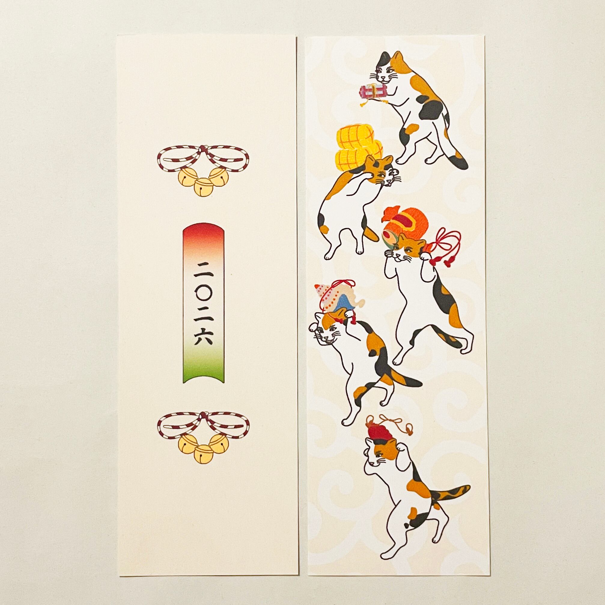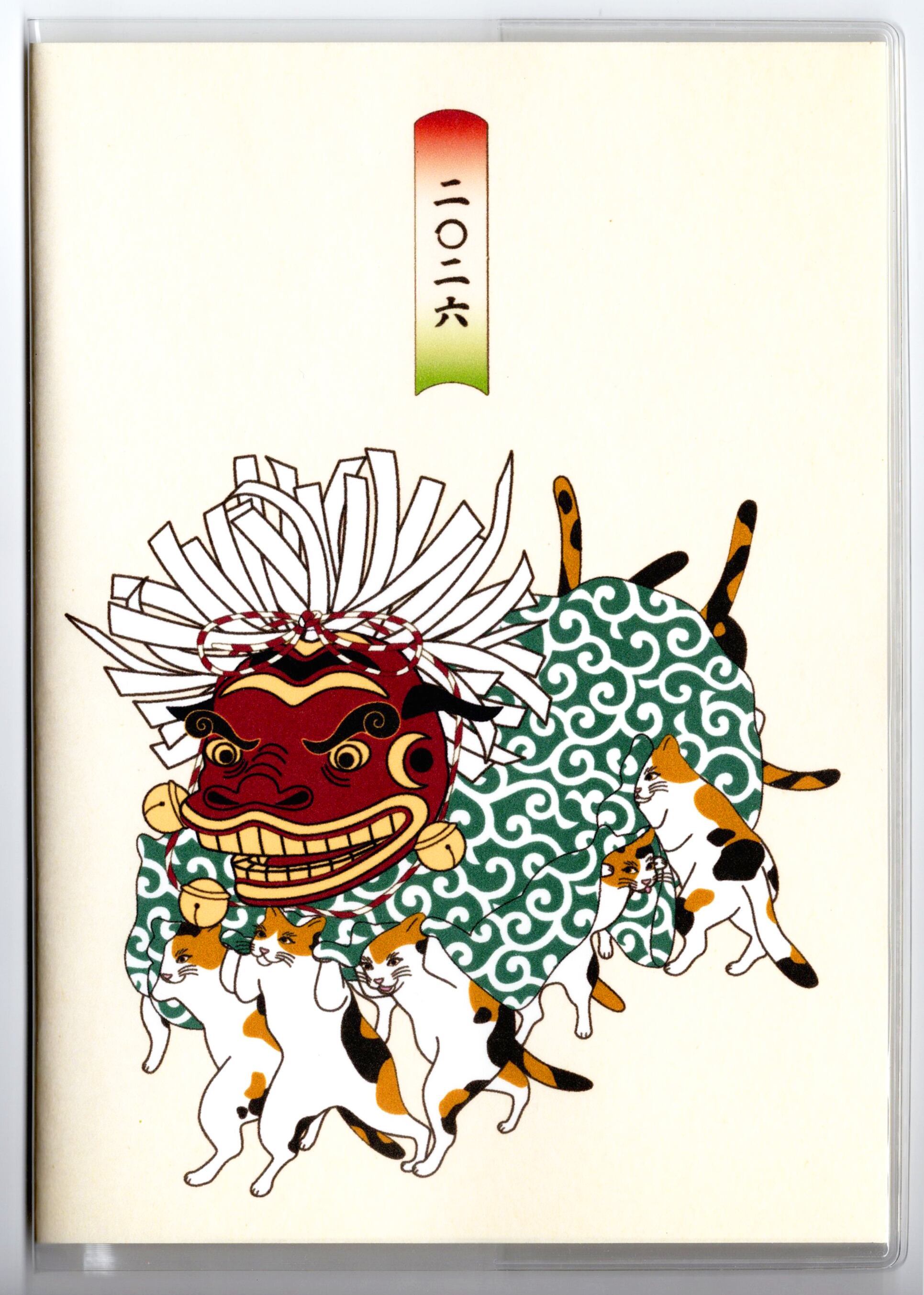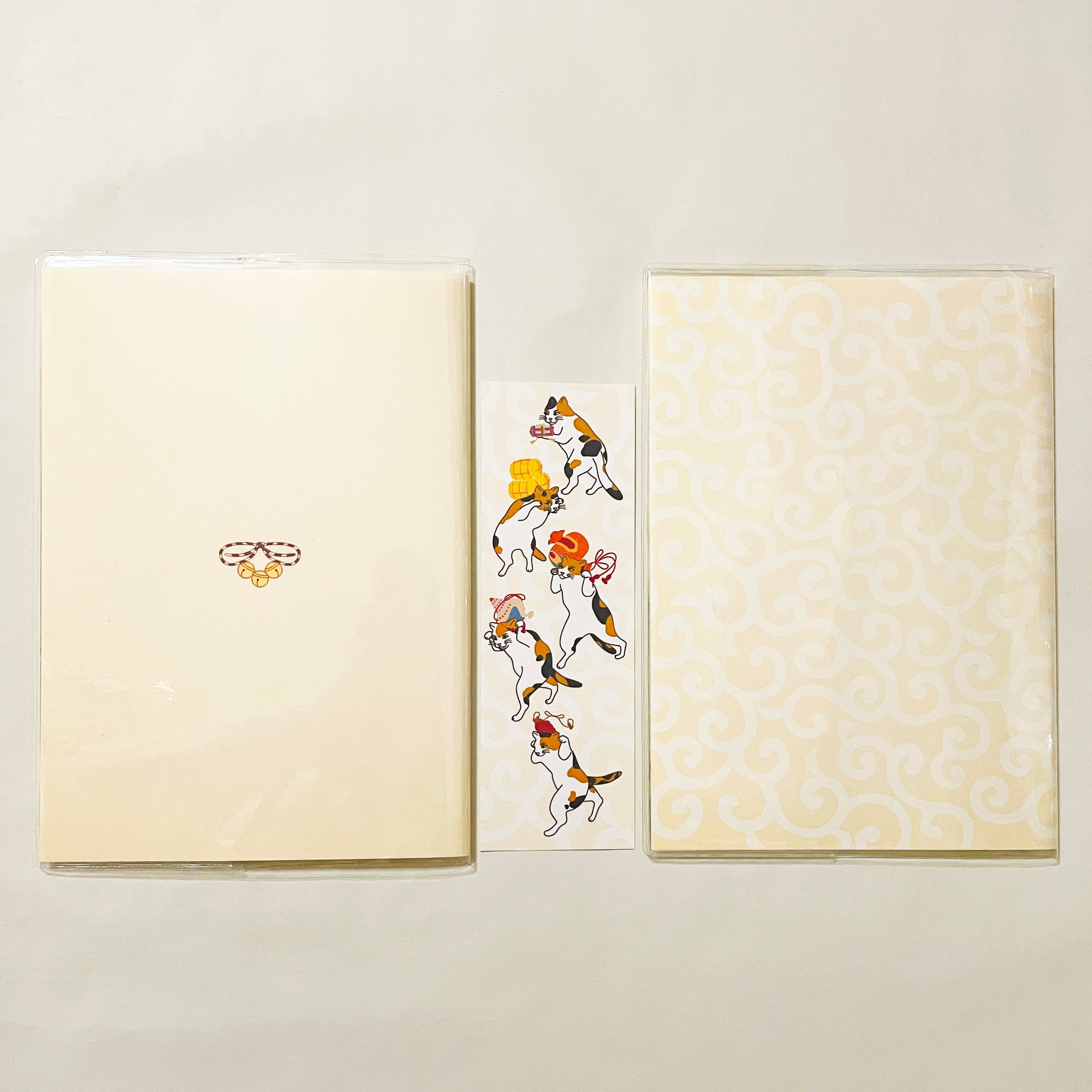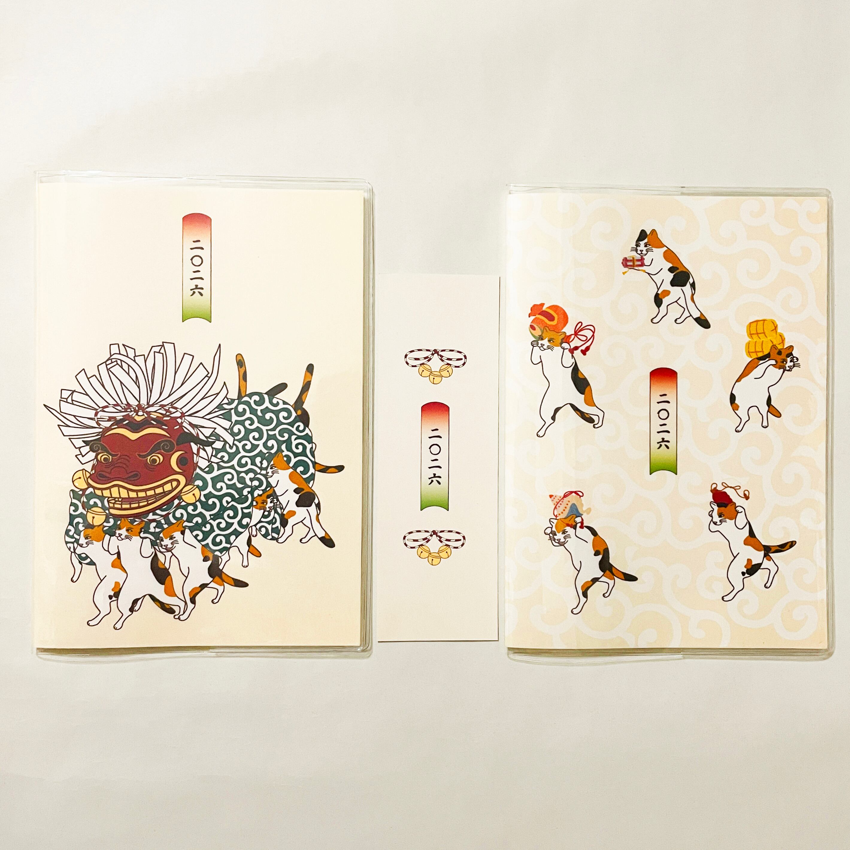 『三毛猫の獅子舞遊び』と『三毛猫の獅子舞遊び-縁起物-』のイラストカバー2枚、ビニールカバー1枚、栞1枚、手帳1冊セット。