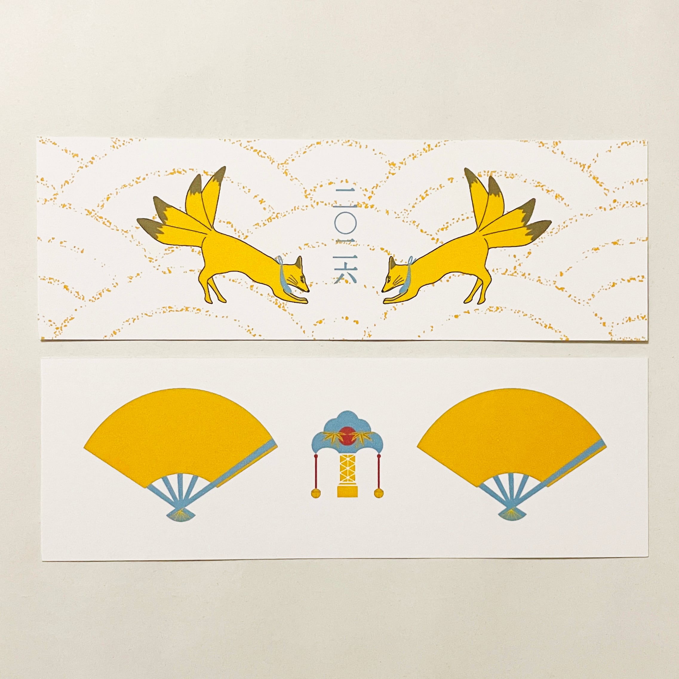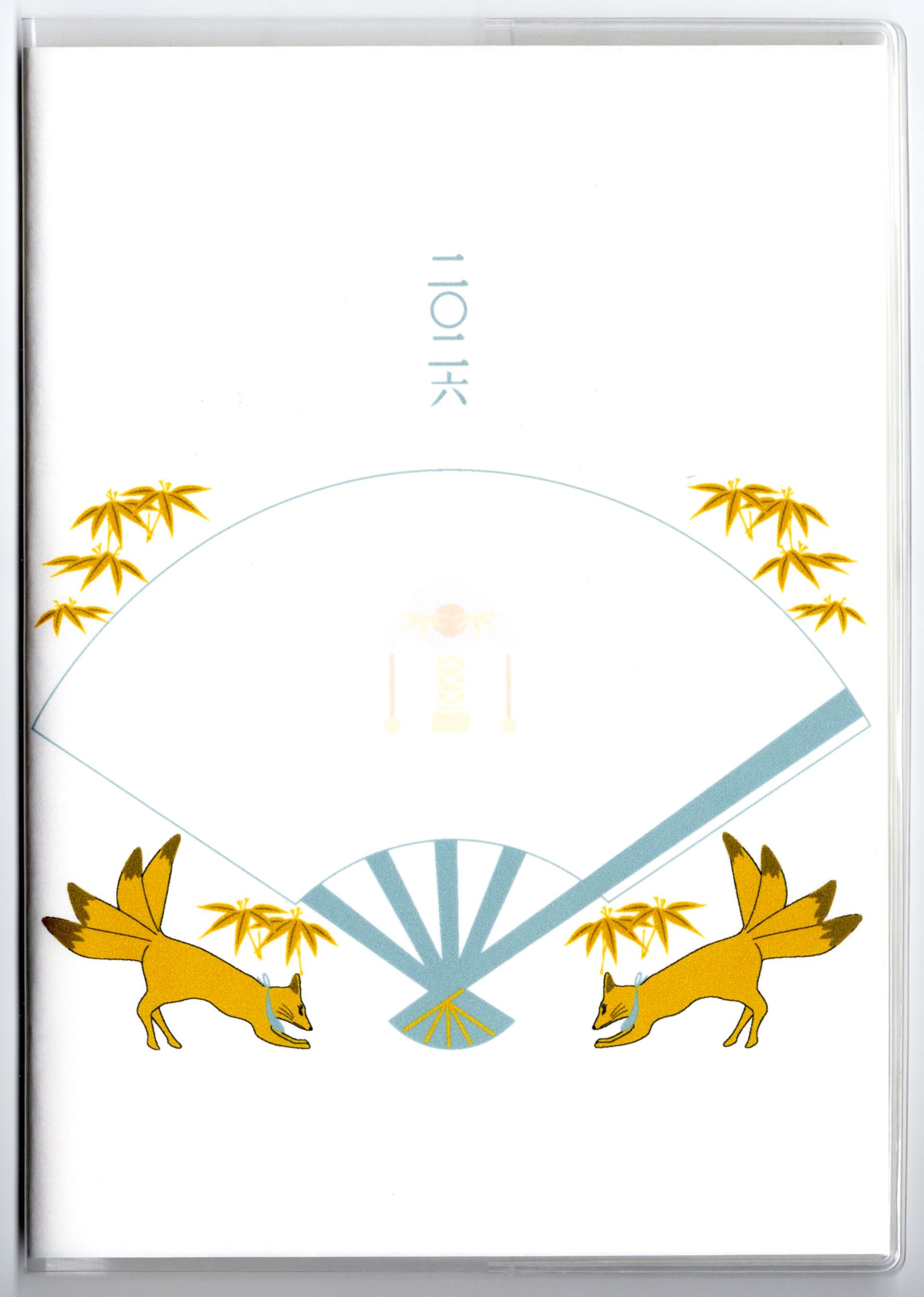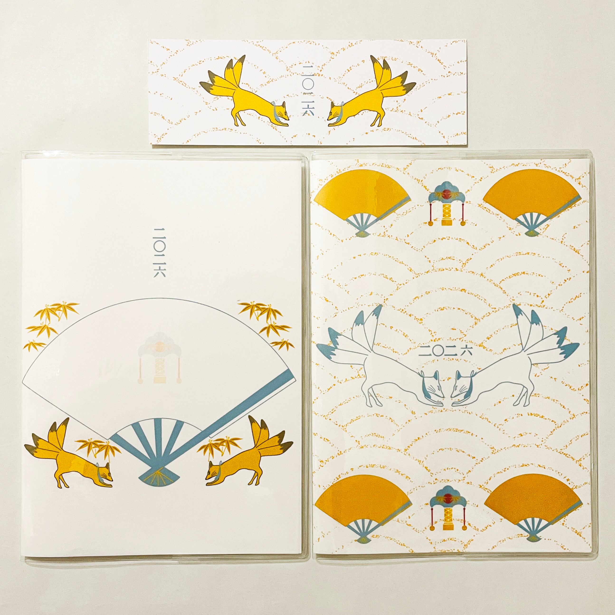 『投扇興天狐』と『投扇興天狐-総柄-』のイラストカバー2枚、ビニールカバー1枚、栞1枚、手帳1冊セット。