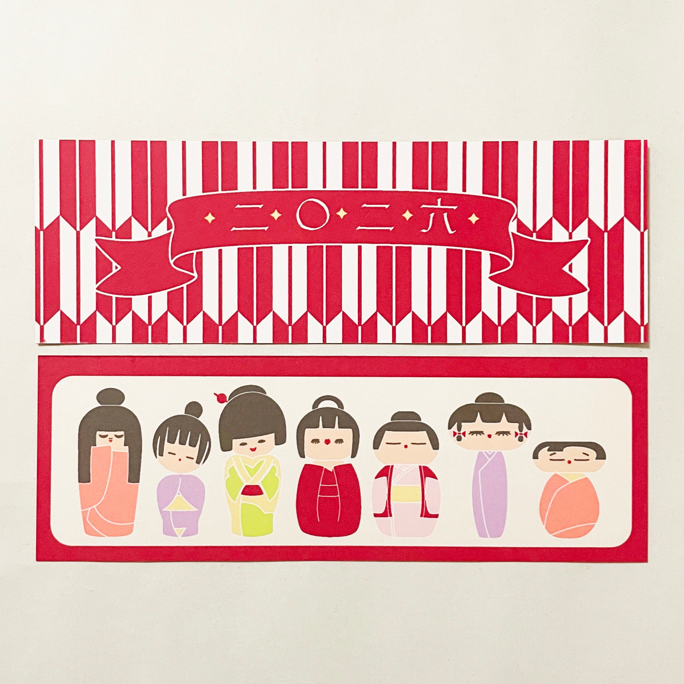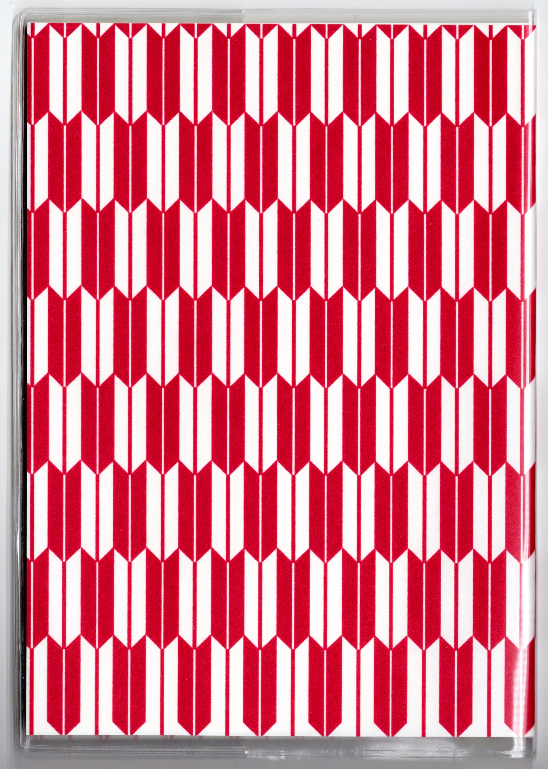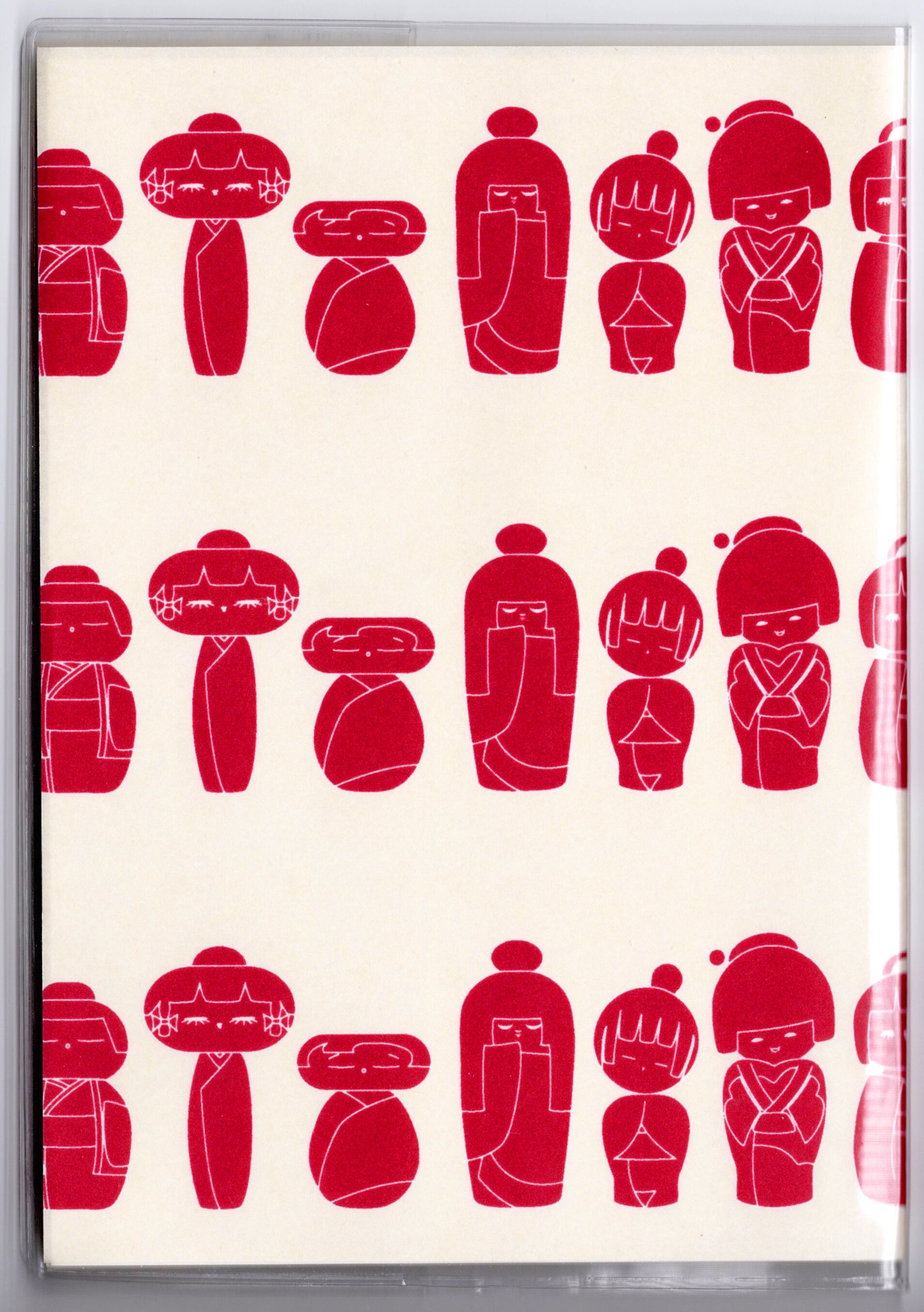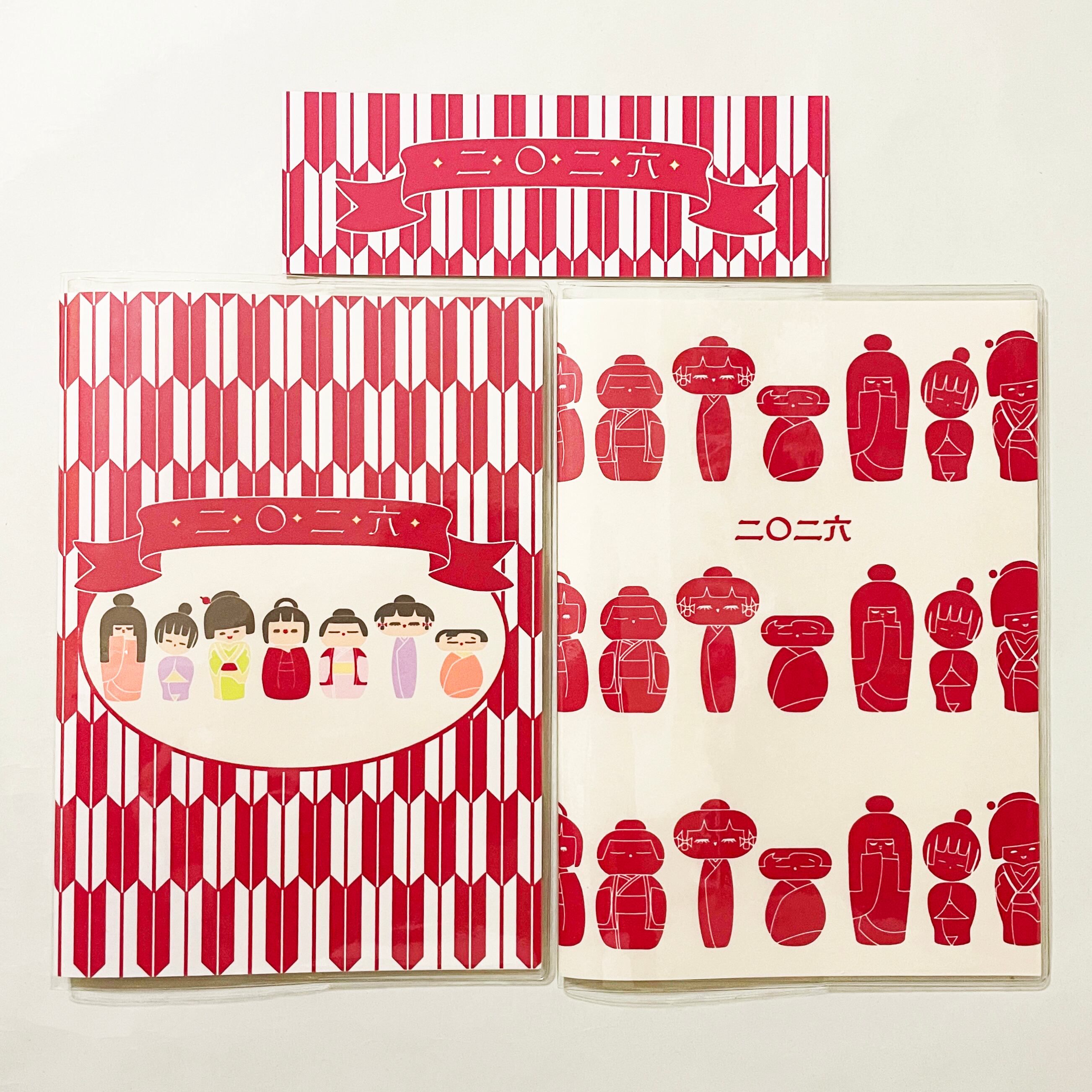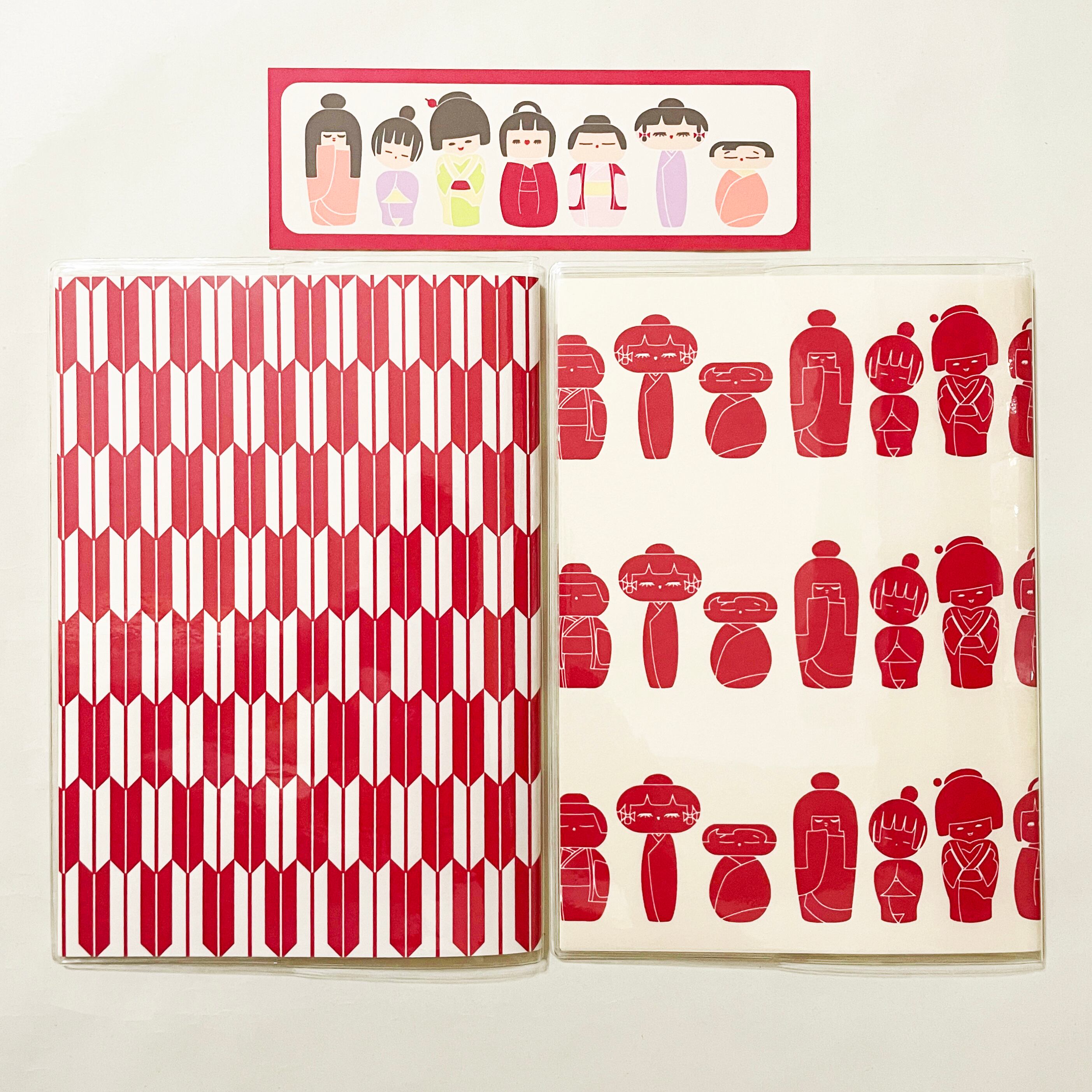 『赤こけし』と『赤こけし-単色-』のイラストカバー2枚、ビニールカバー1枚、栞1枚、手帳1冊セット。