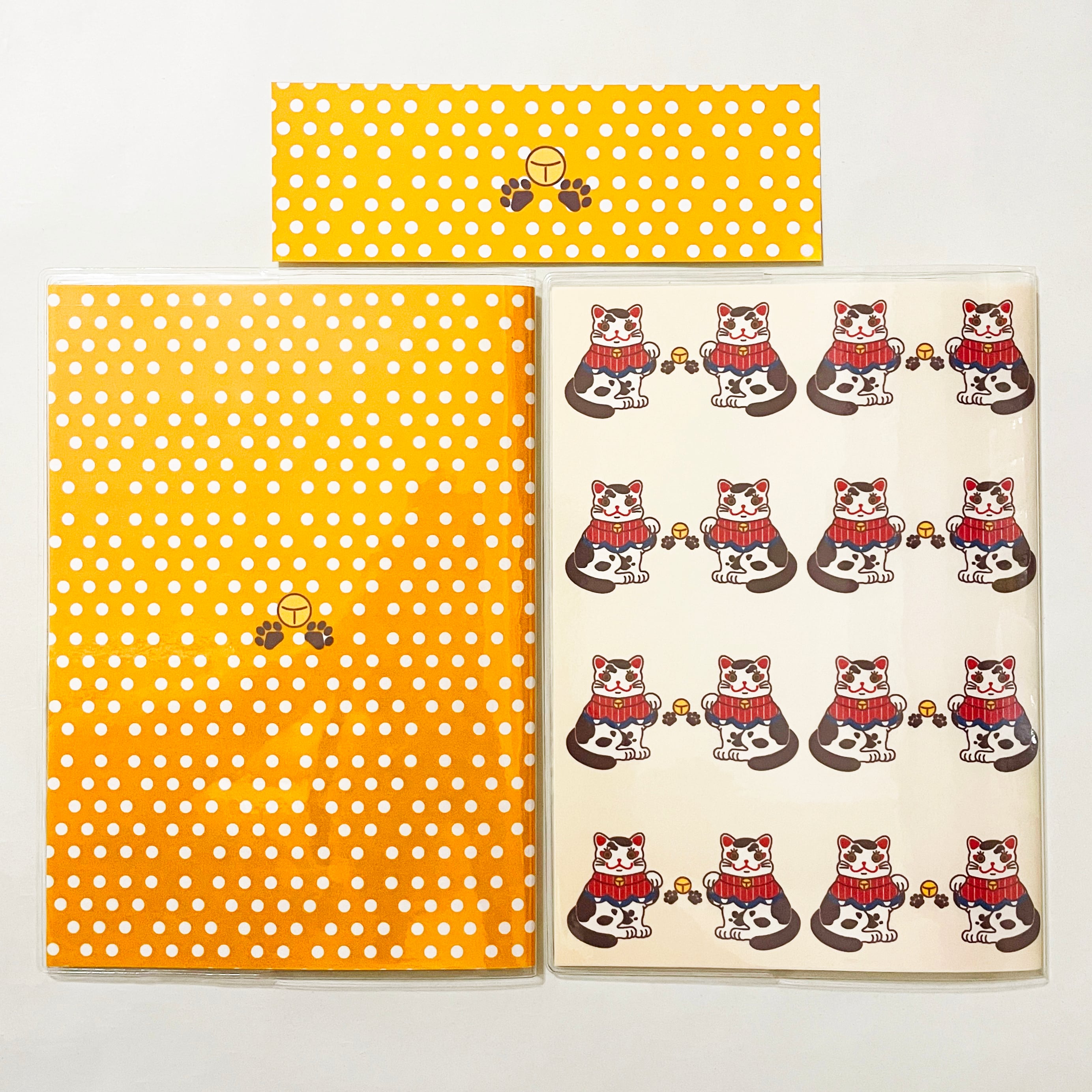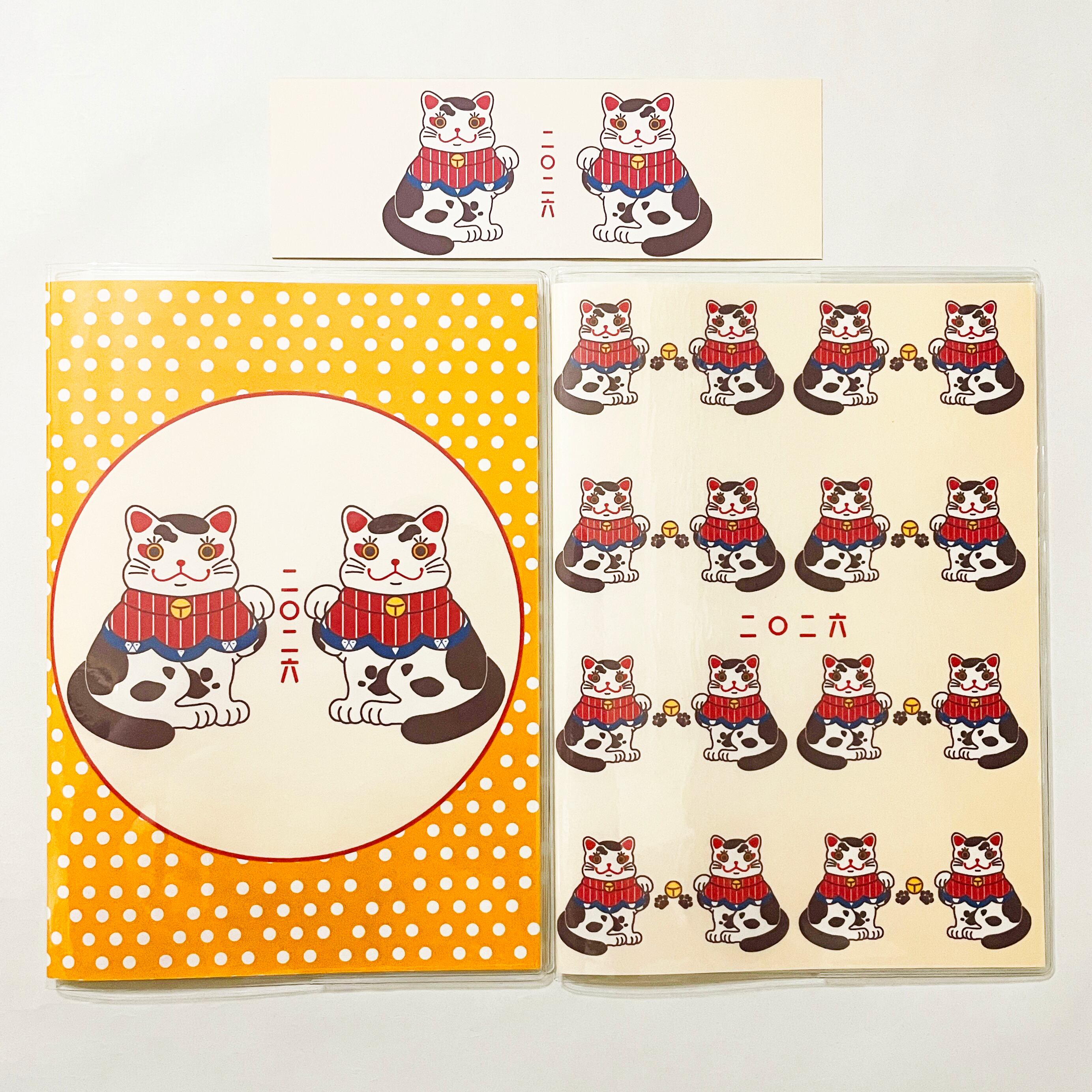 『福招き猫』と『福招き猫-総柄-』のイラストカバー2枚、ビニールカバー1枚、栞1枚、手帳1冊セット。