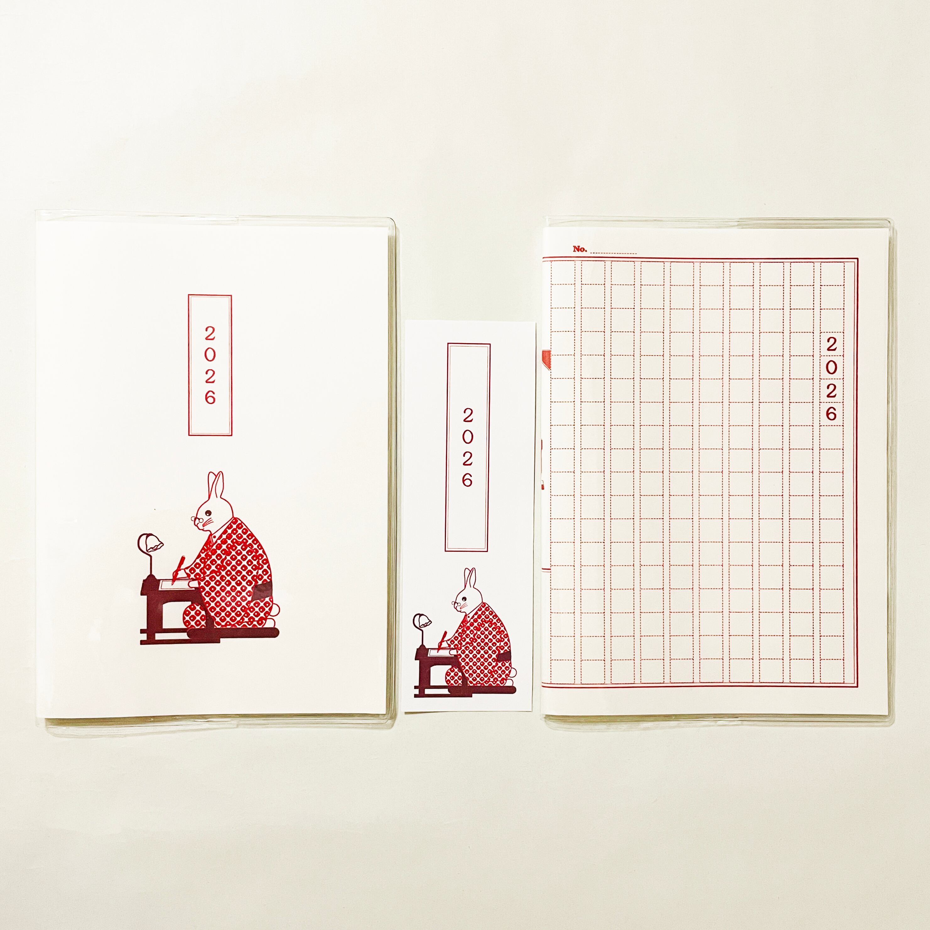 『文豪兎』と『原稿用紙』のイラストカバー2枚、ビニールカバー1枚、栞1枚、手帳1冊セット。