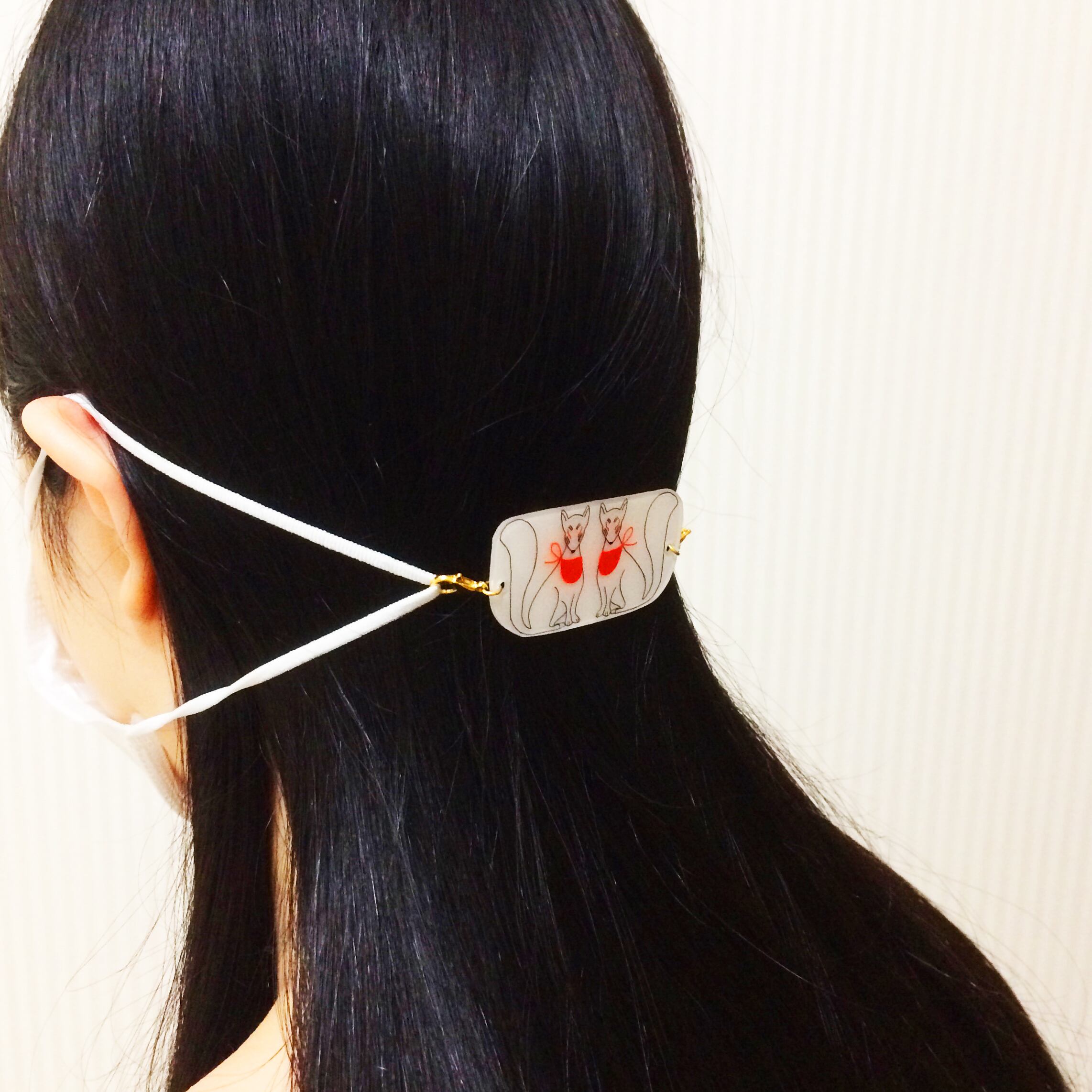 既製品や手作りマスクなどによって紐の長さや個人差によって使用しやすいサイズが異なる可能性があるため、サイズの異なる狛狐と水引のアクセサリーの2つを使い分けてください。