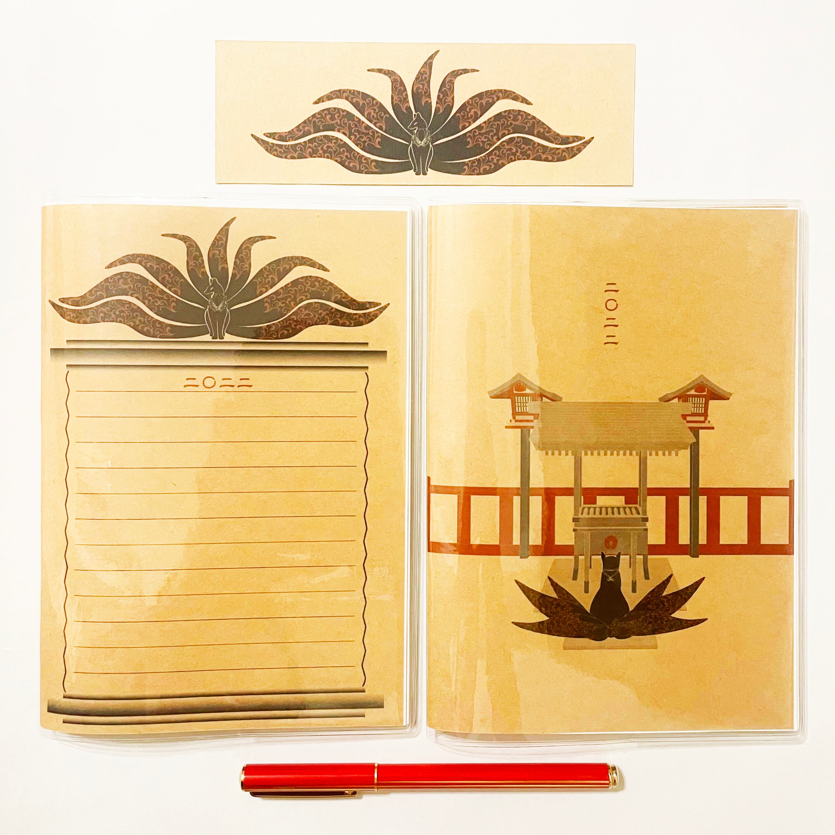 『黒九尾の狐火』と『黒九尾の狐火-御賽銭箱-』のイラストカバー2枚、ビニールカバー1枚、栞1枚、手帳1冊セット。