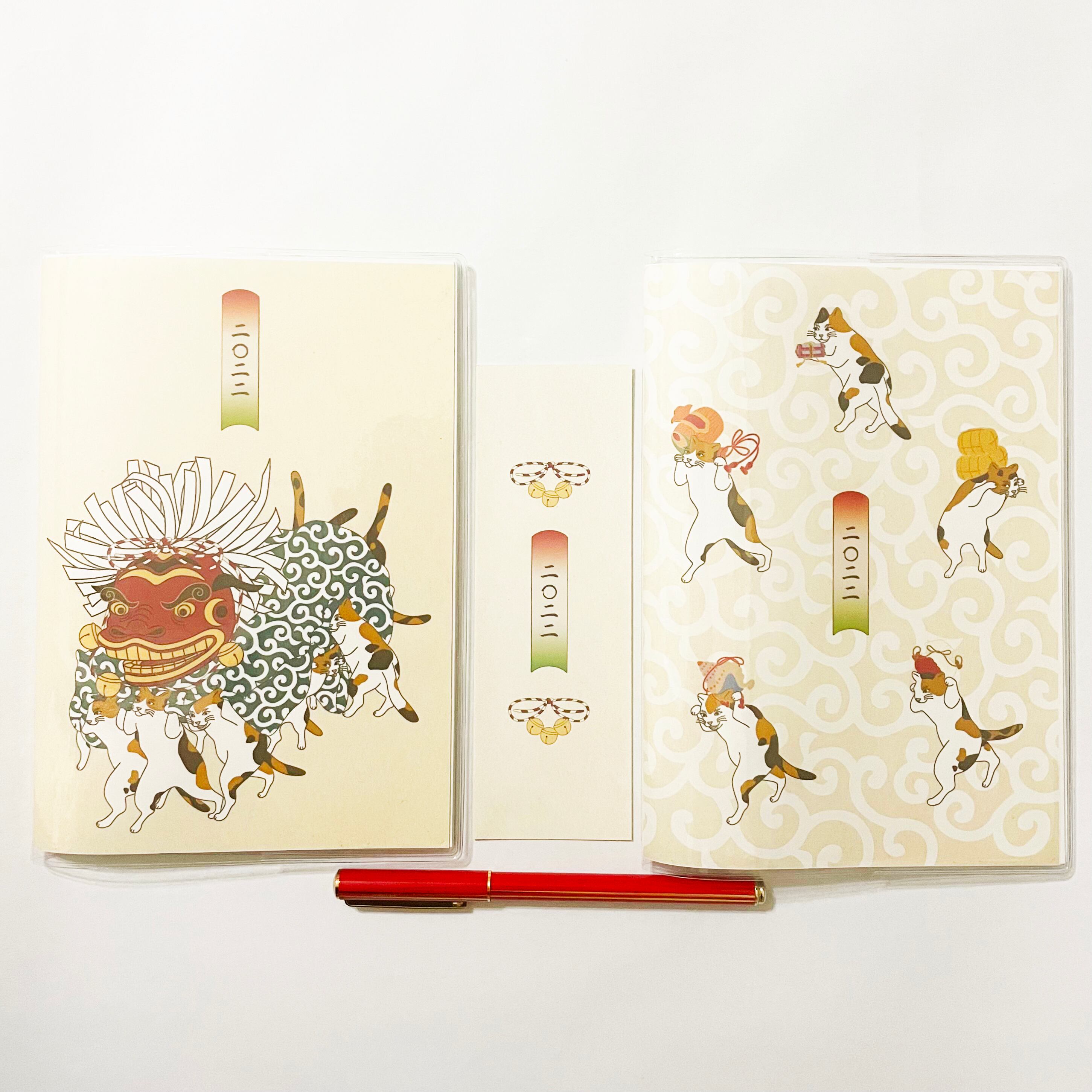 『三毛猫の獅子舞遊び』と『三毛猫-縁起物-』のイラストカバー2枚、ビニールカバー1枚、栞1枚、手帳1冊セット。