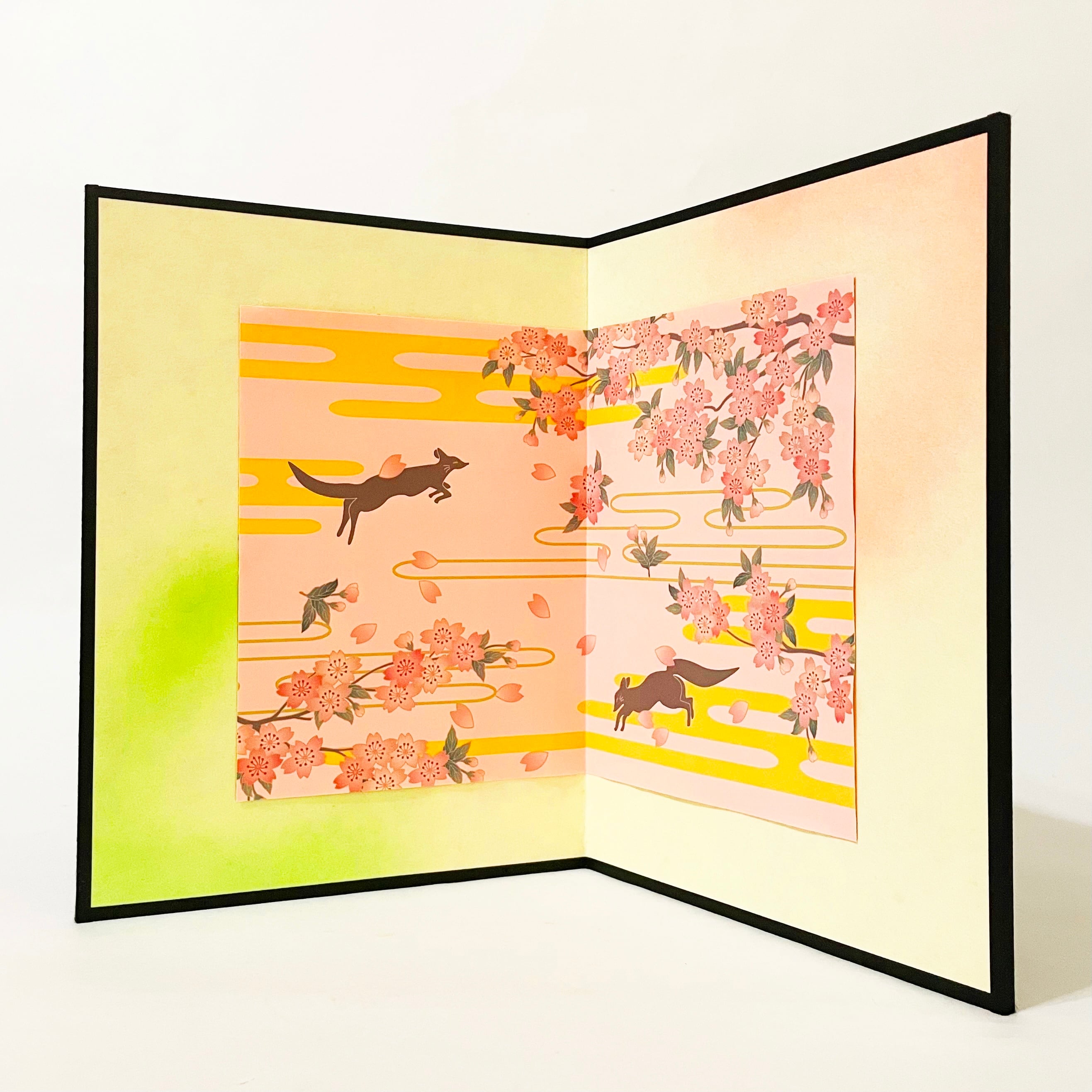 桜吹雪と狐 春飾り屏風 色紙 桜 雲 松 梅 和柄 春 イラスト 狐の嫁入り 狐面