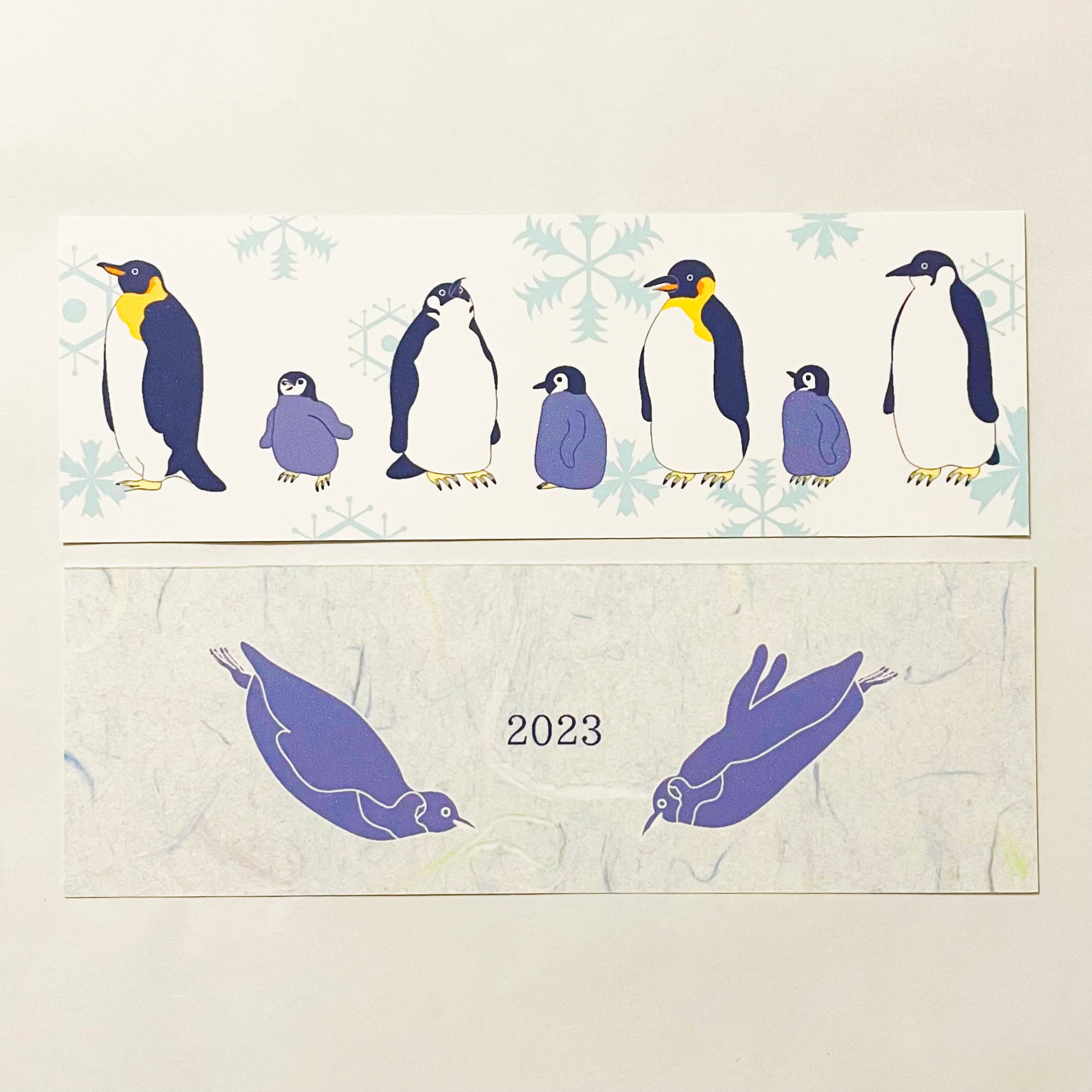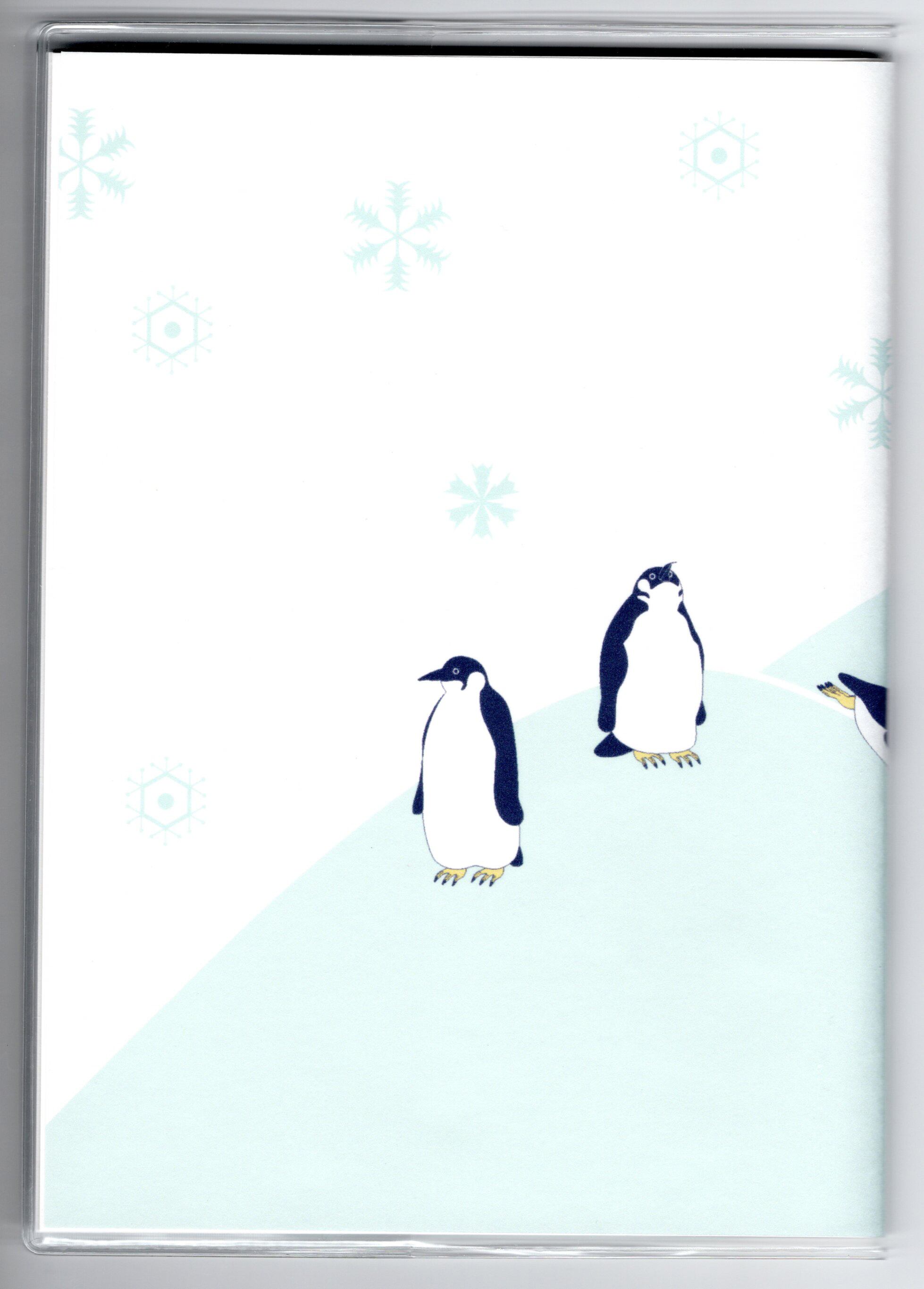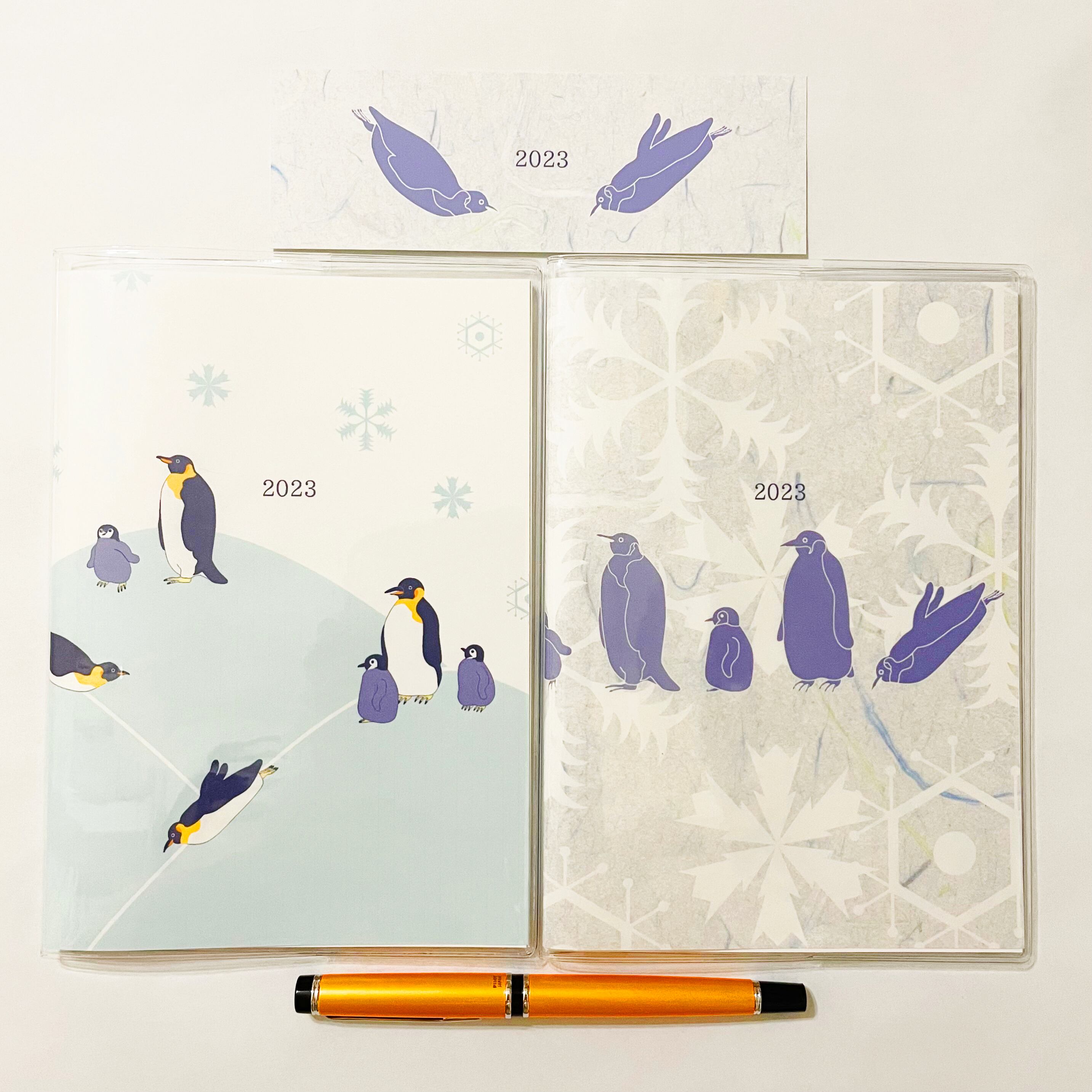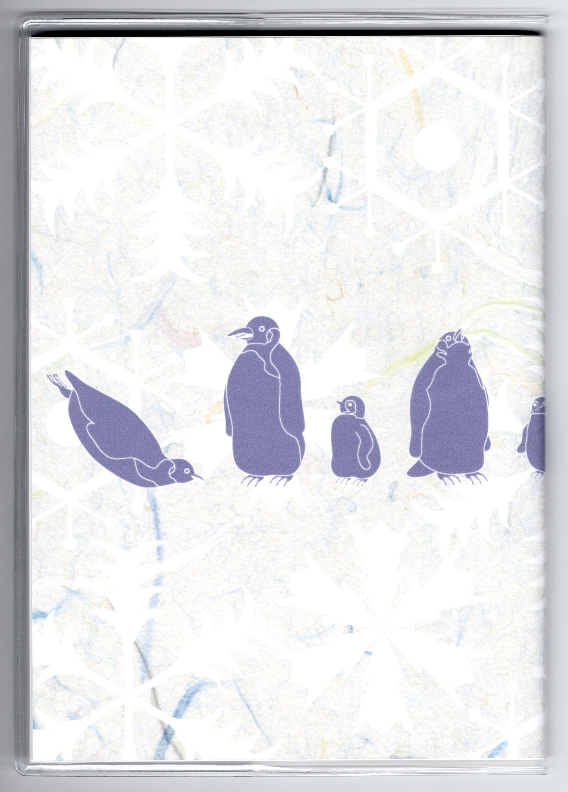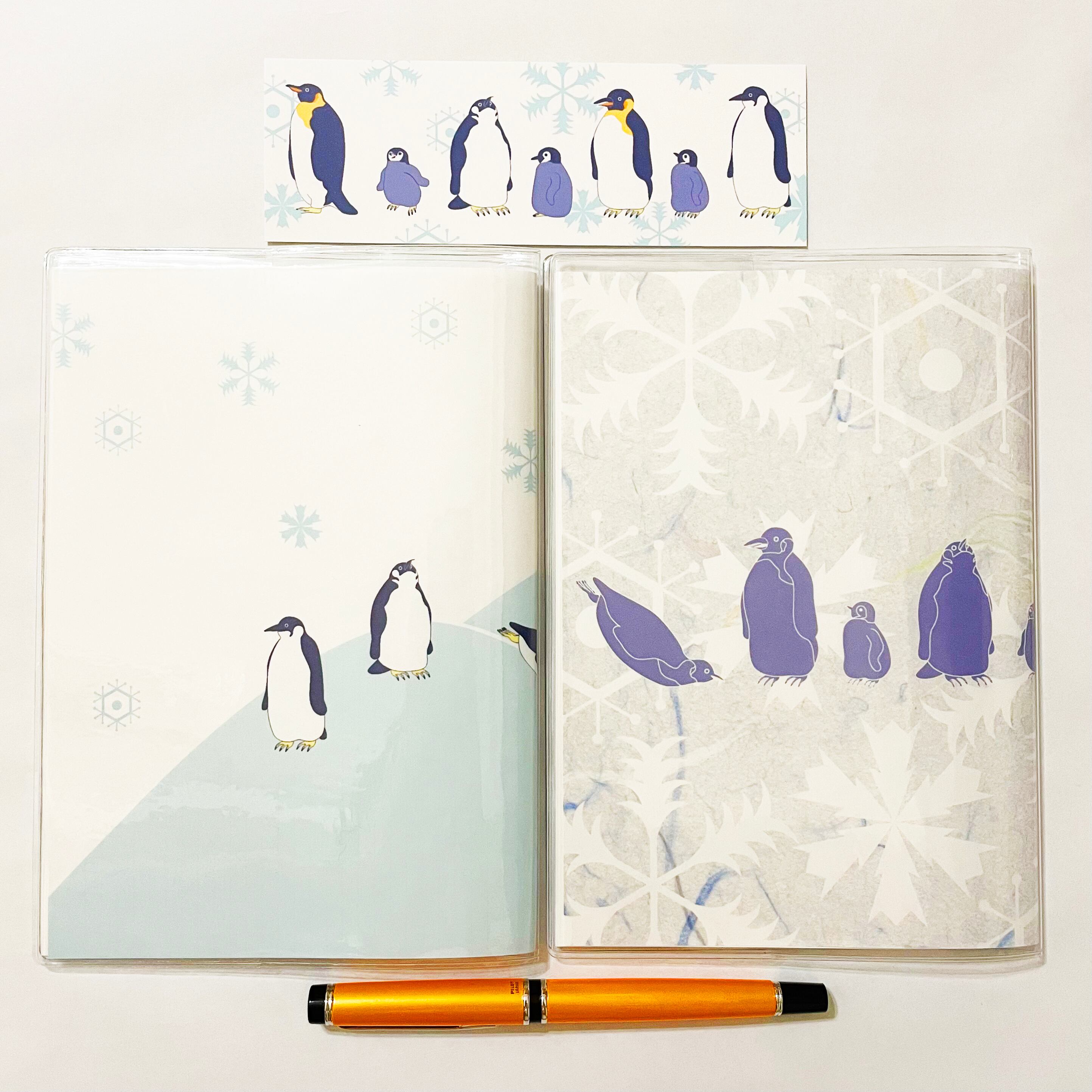 『皇帝ペンギン』と『皇帝ペンギン-総雪柄-』のイラストカバー2枚、ビニールカバー1枚、栞1枚、手帳1冊セット。