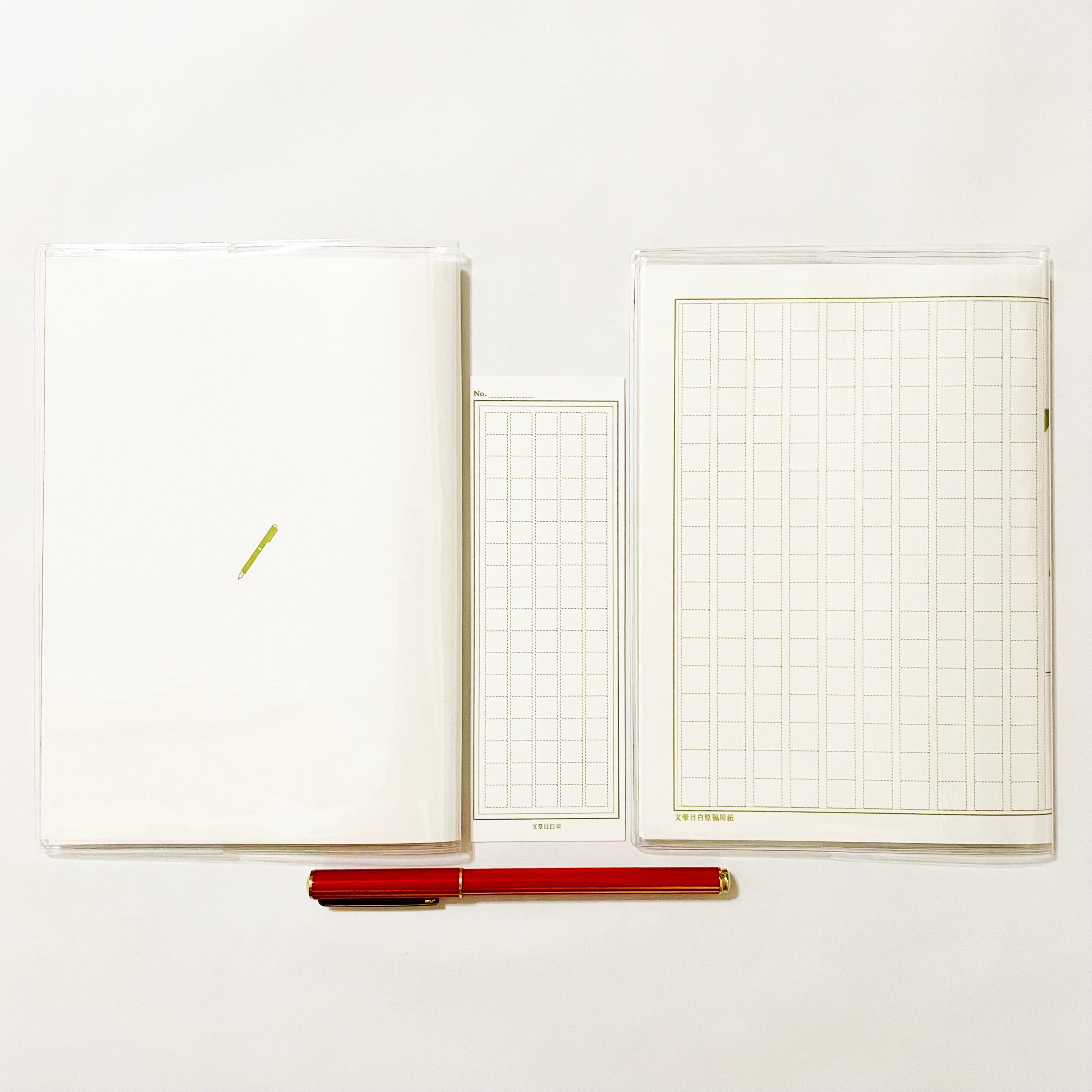 『文豪目白』と『原稿用紙』のイラストカバー2枚、ビニールカバー1枚、栞1枚、手帳1冊セット。