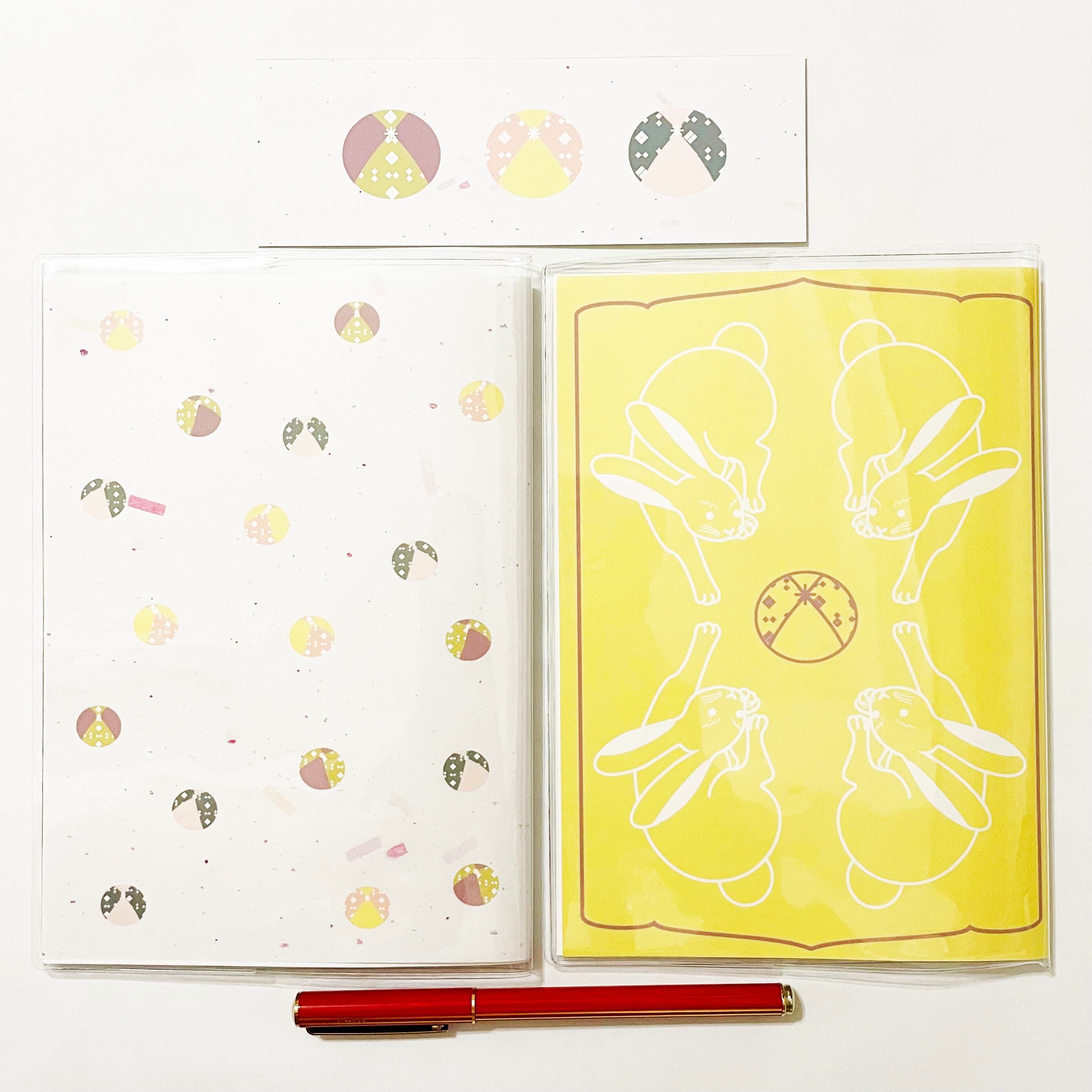 『御手玉兎』と『御手玉兎-枠付き-』のイラストカバー2枚、ビニールカバー1枚、栞1枚、2023年の文字印刷の手帳1冊セット。