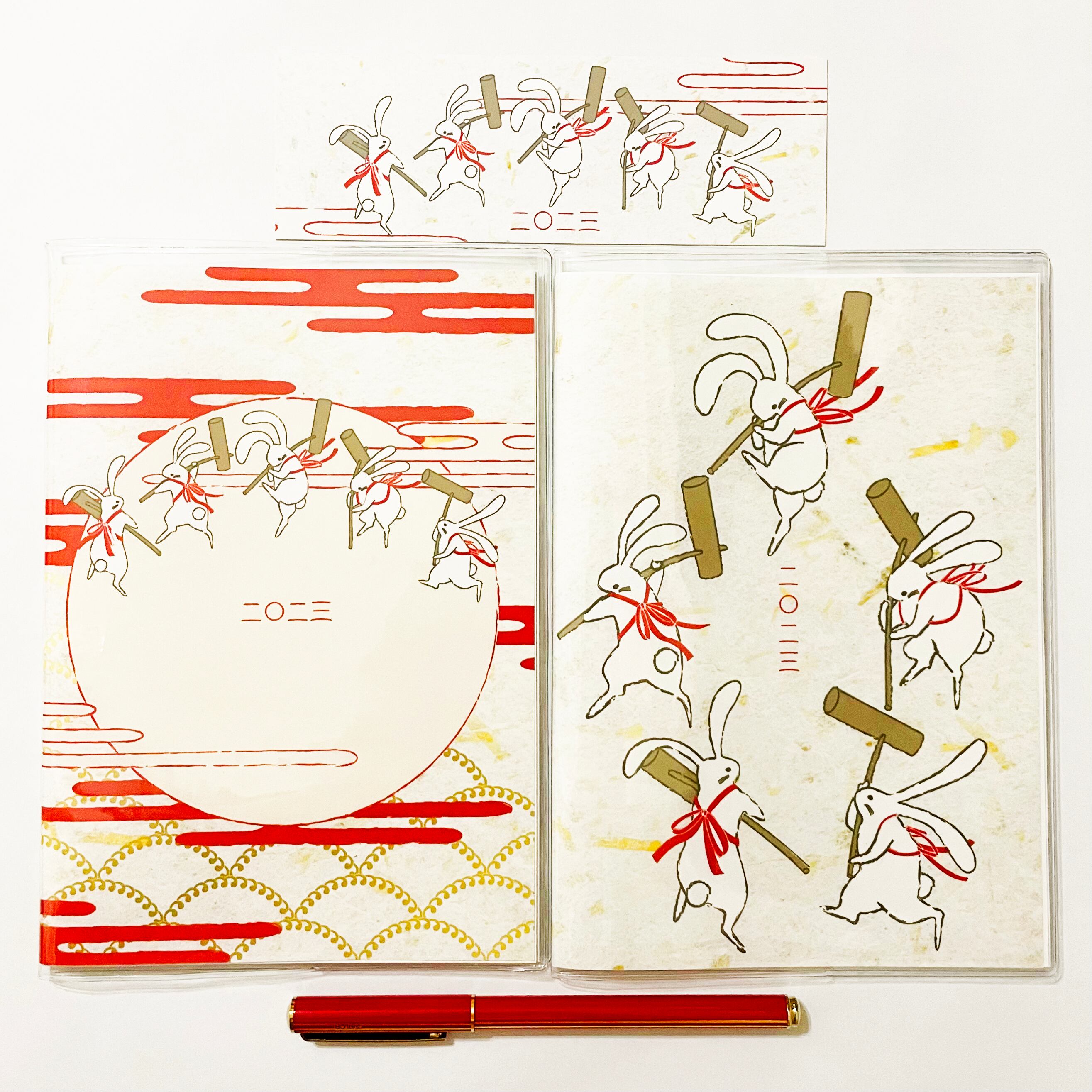 『餅つき兎』と『餅つき兎-大-』のイラストカバー2枚、ビニールカバー1枚、栞1枚、2023年の文字印刷の手帳1冊セット。